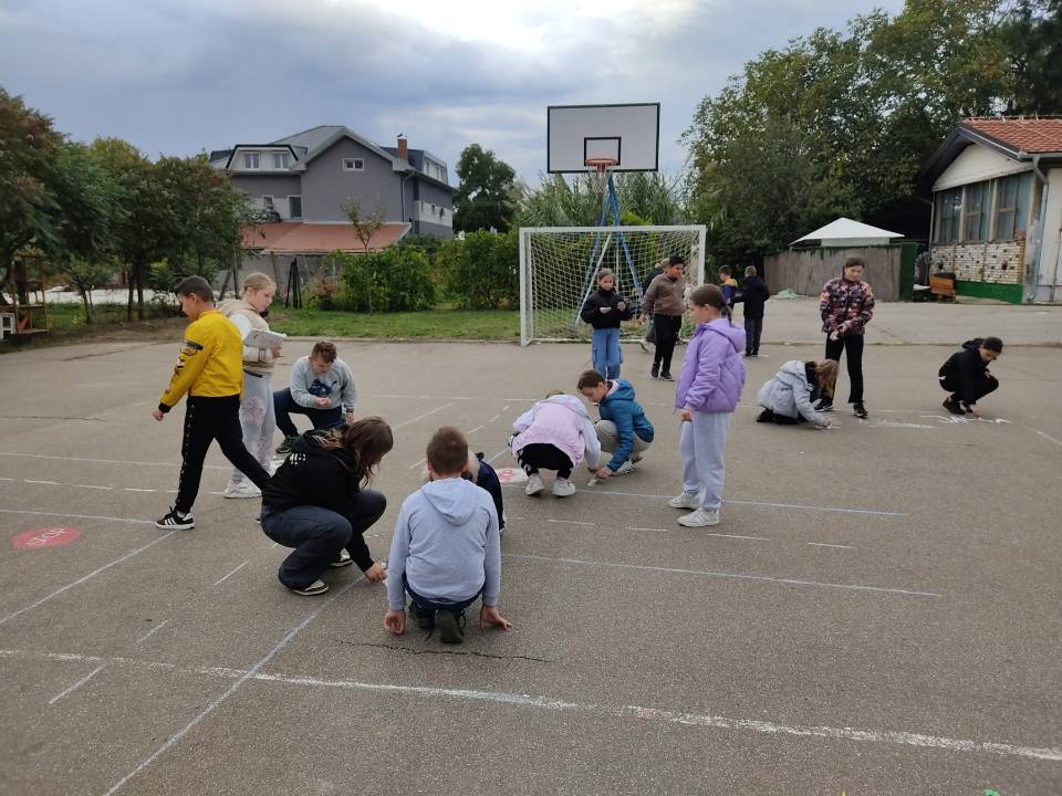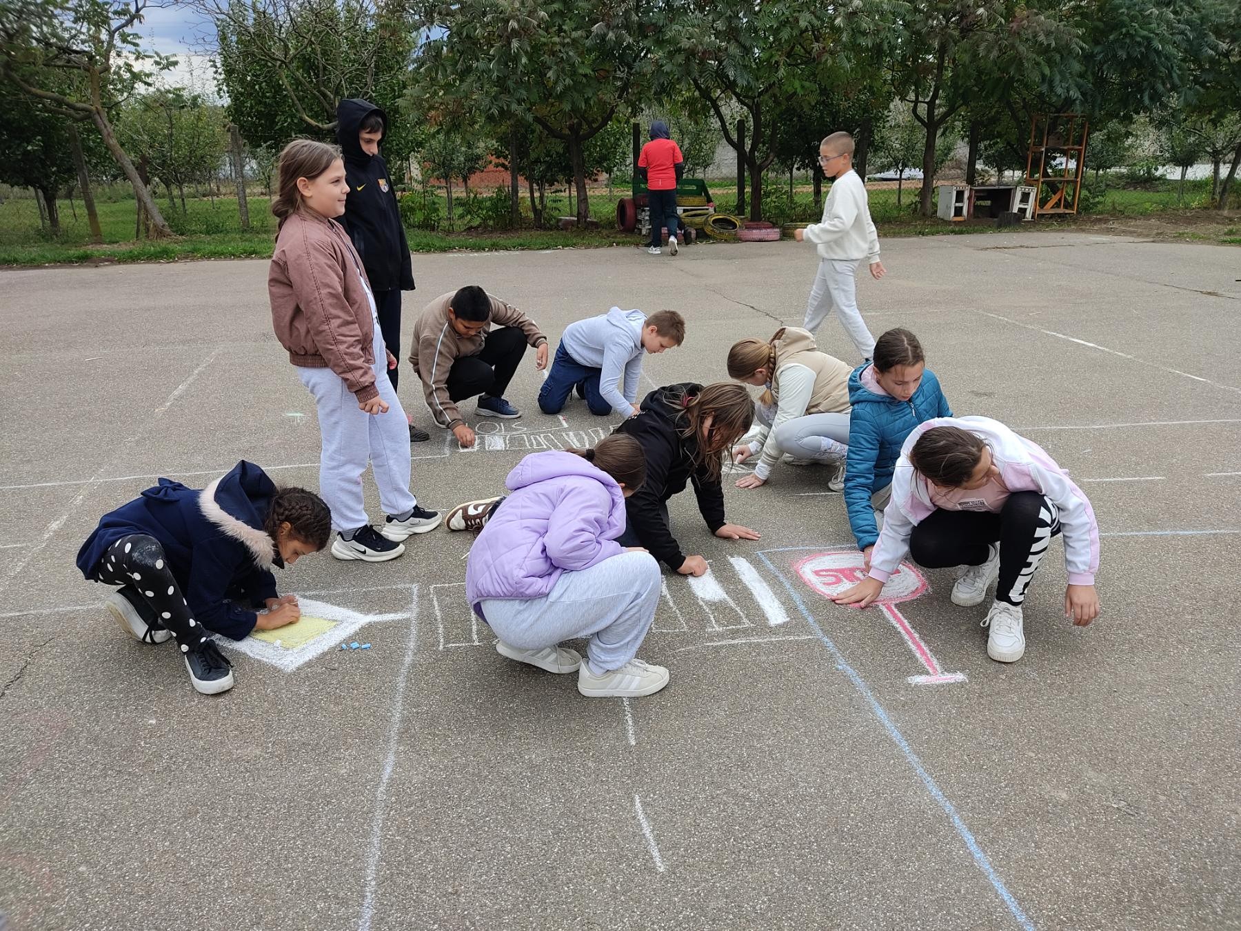 Ученици петог разреда су са наставником Небојшом Милутиновић у оквиру часа технике и технологије цртали саобраћајни полигон у школском дворишту.